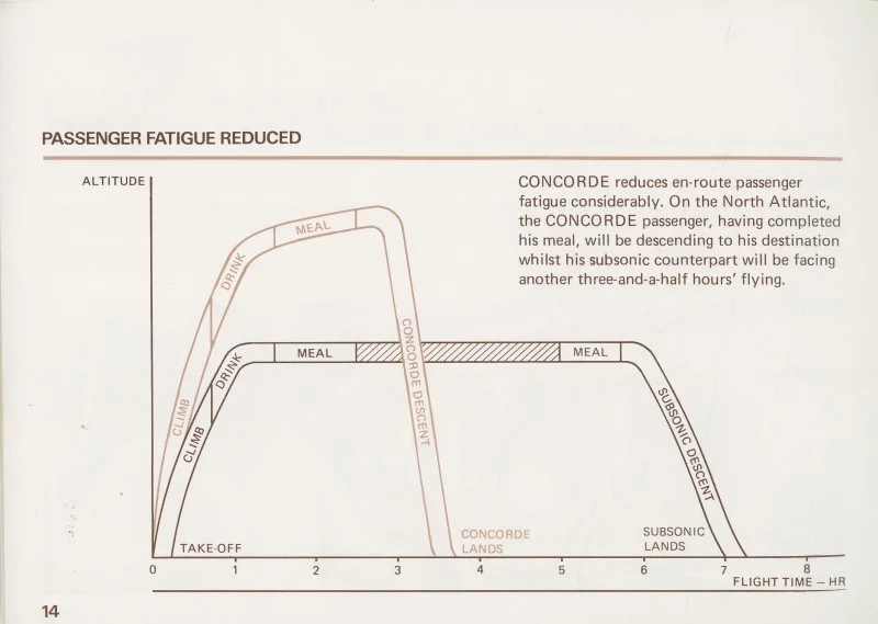 The first item is from a booklet of “Concorde Facts” and highlights some of the advantages of Concorde. This graph comparing a flight to the US on Concorde and a flight to the US in a subsonic jet shows how the difference in flight time actually splits up into in-flight activity for the passenger.